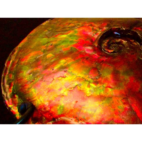 L’ammolite est une pierre précieuse considérée comme une gemme officielle par le CIBJO ( Commission internationale bijouterie, joaillerie, orfèvrerie). Ce spécimen brille de multiples teintes de vert, de jaune et de rouge. Constitué de coquilles fossilisées d’ammonite. Contient de l’aragonite ( constituant de la nacre), calcite, pyrite…